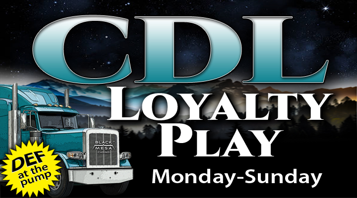 Step on those brakes for CDL Loyalty Play at Black Mesa Casino! Earn 100 base points for $10 Loyalty Play.
